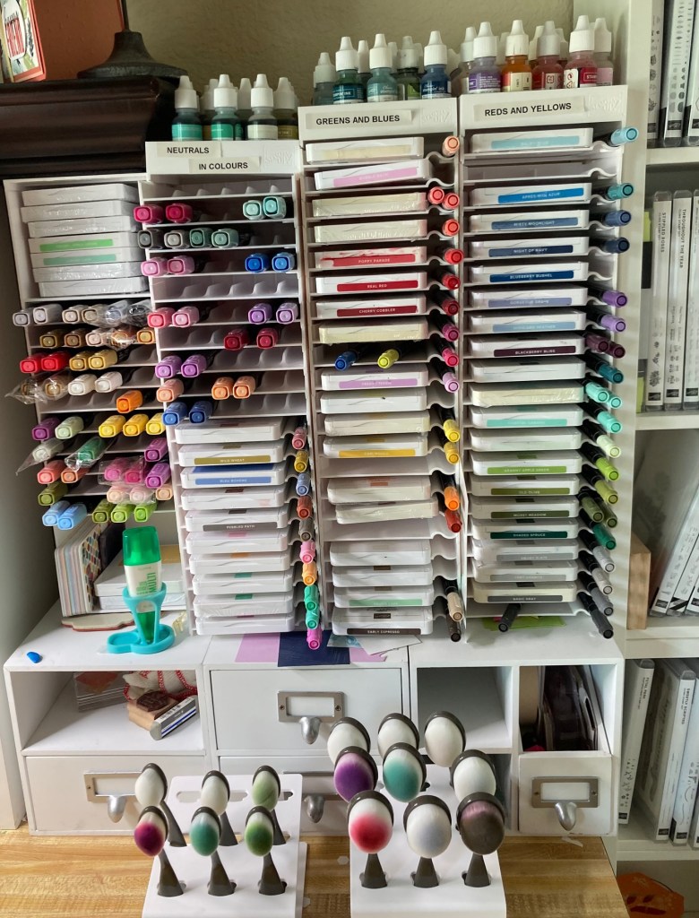 I keep my inks in color ranges, all the reds together, the blues and greens etc. I find it easier to choose a red, for example when then are all in one place rather than dotted around within the different color families. But that is what works for me, you might like to have them in families, alphabetically or maybe in the shades of the rainbow. That is what is so wonderful about crafting…. do your thing, your way!!!