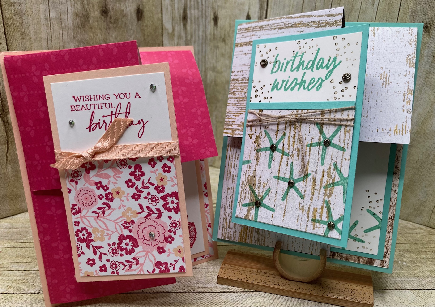 I have no idea what to call this fold other than a Pop UP Corner. It showcases double sided decorative paper perfectly. I enjoyed making the feminine one so much that I also made a more masculine version and made a video while I was at it……….. enjoy 🙂