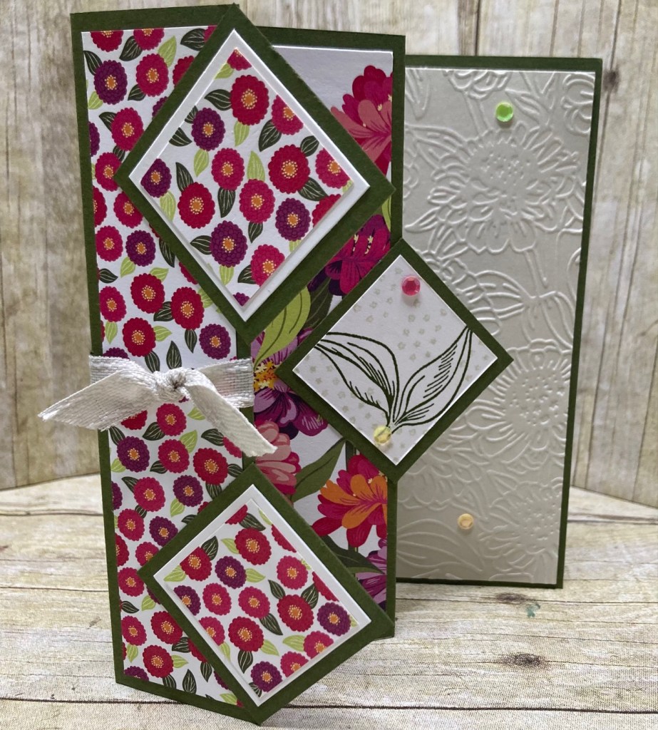 How about a quick fun fold that has lots of layers and lots of interest? I focused on the Flowering Zinnia Suite of products which is an online exclusive product (which means it is not in a catalog but you can order it from my online store – see the links below ) 🙂