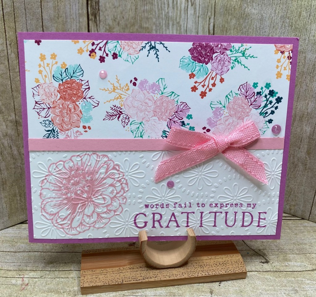 I truly appreciate my wonderful customers, their support of my classes and for them choosing to shop for the Stampin’ UP! products from me. Each month I send a thank you to those that have shopped with me either directly or thru my online store. Today I share my June thank you card which showcases a couple of the new 2024 – 2026 In Colors, decorative papers, embellishments and ribbon. (ps there is a video with this one!)