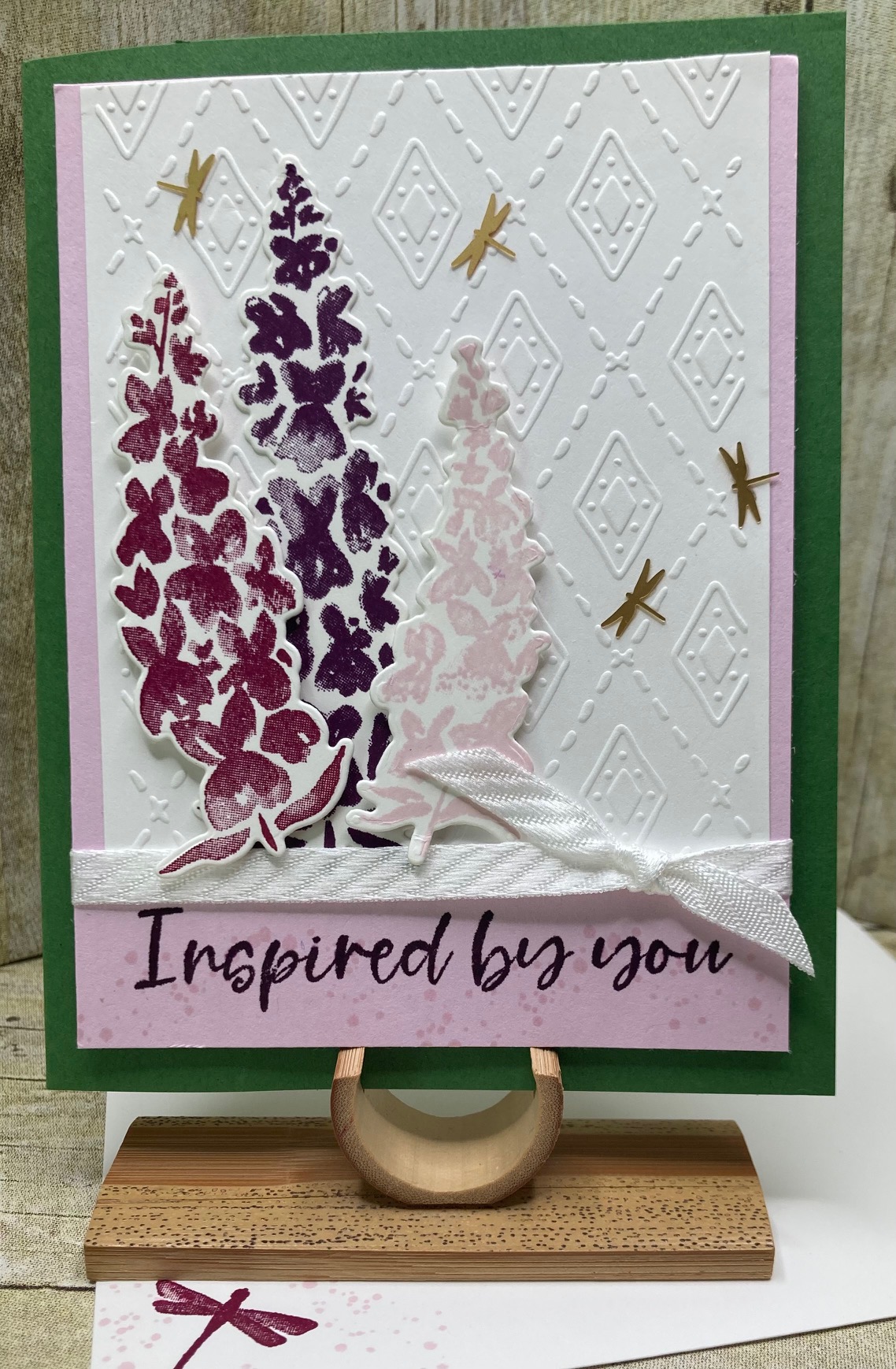 So I have been playing with some colors inspired by a Facebook challenge and pulled together this card featuring the Inspiring Snapdragons Stamp Set with coordinating Dies. The challenge colors were, Garden Green, Blackberry Bliss, Berry Burst & Bubble Bath.