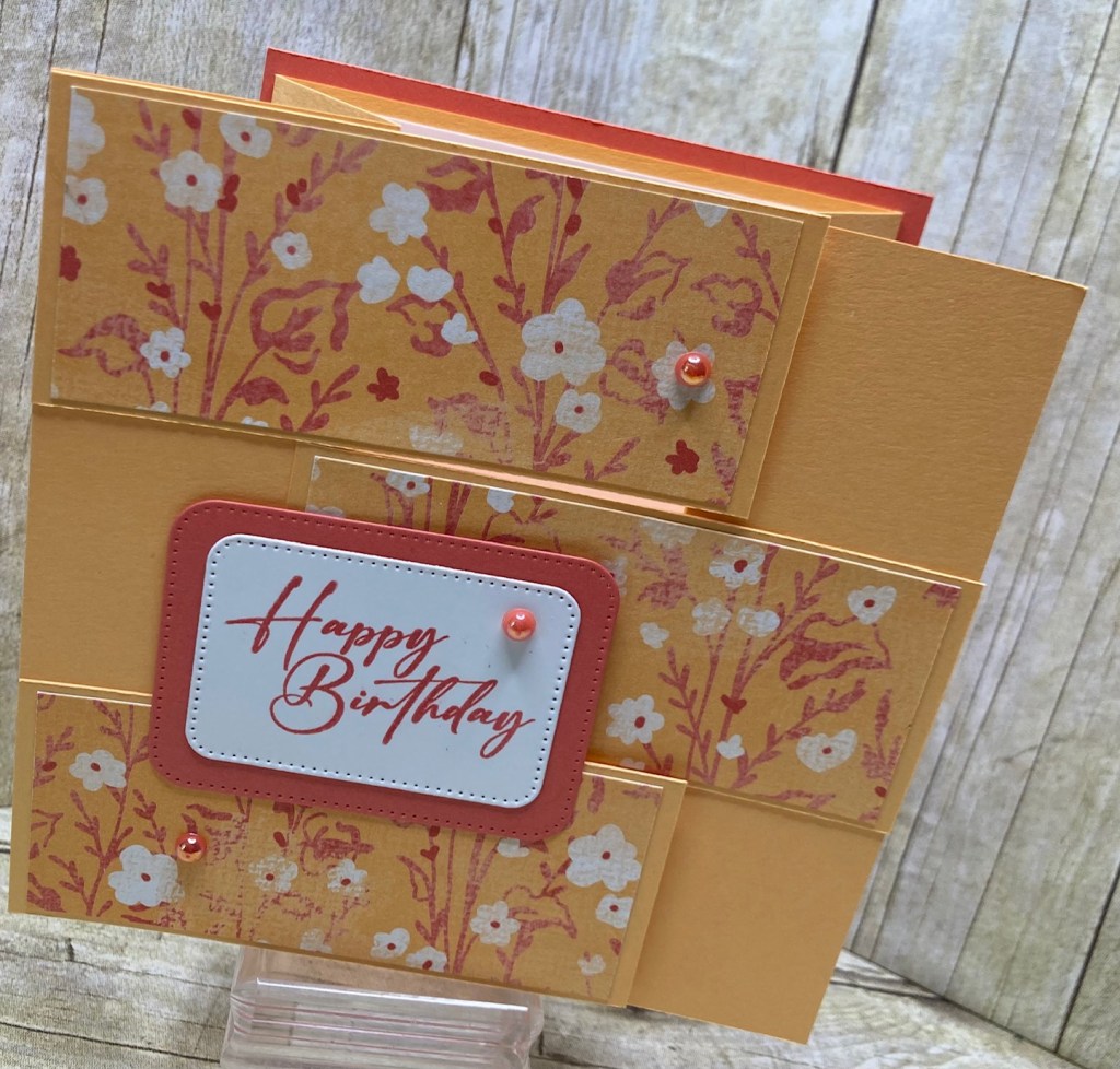 So this is the first time I have featured Peach Pie – one of the new 2024 – 2026 In colors, it pairs beautifully with Calypso Coral and the Unbounded Beauty Decorative Paper Pack which I have used a few times. My card is a fancy fold – with 3 panels that forms the front.