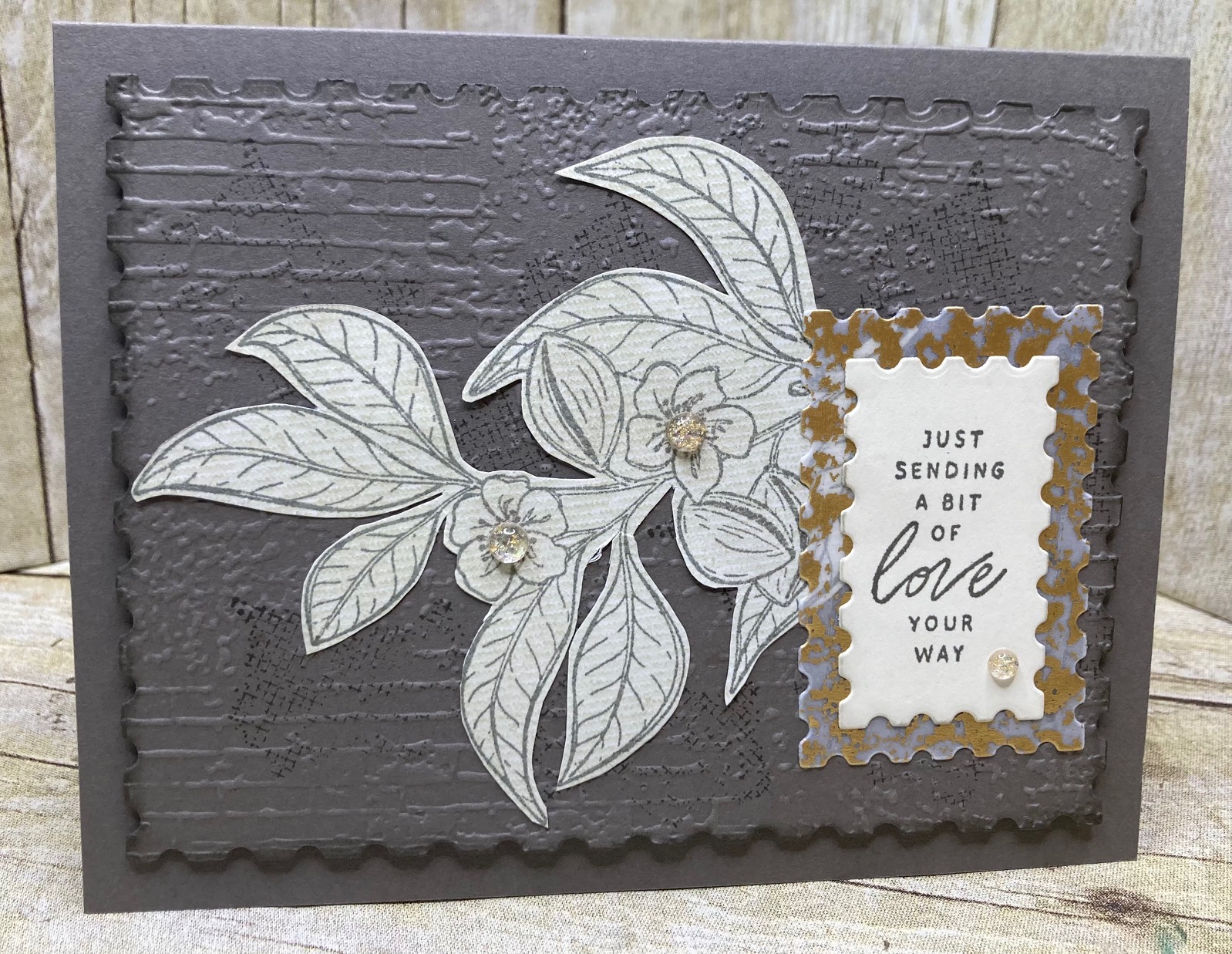 • Layer 1: 51/2 x 4 1/4 Pebbled Path Card ~ run thru the Cut & Emboss Machine with the largest Perennial Postage Die and the Exposed Brick Embossing Folder