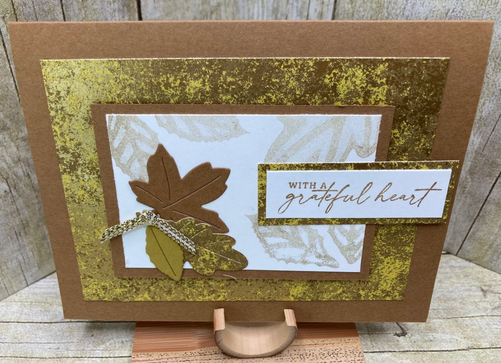 The stamp set is Autumn Leaves with the Autumn Leaves Dies to create the leaf embellishment using some scraps of Pecan Pie, Wild Wheat & Distressed Gold Specialty Paper (now retired)
