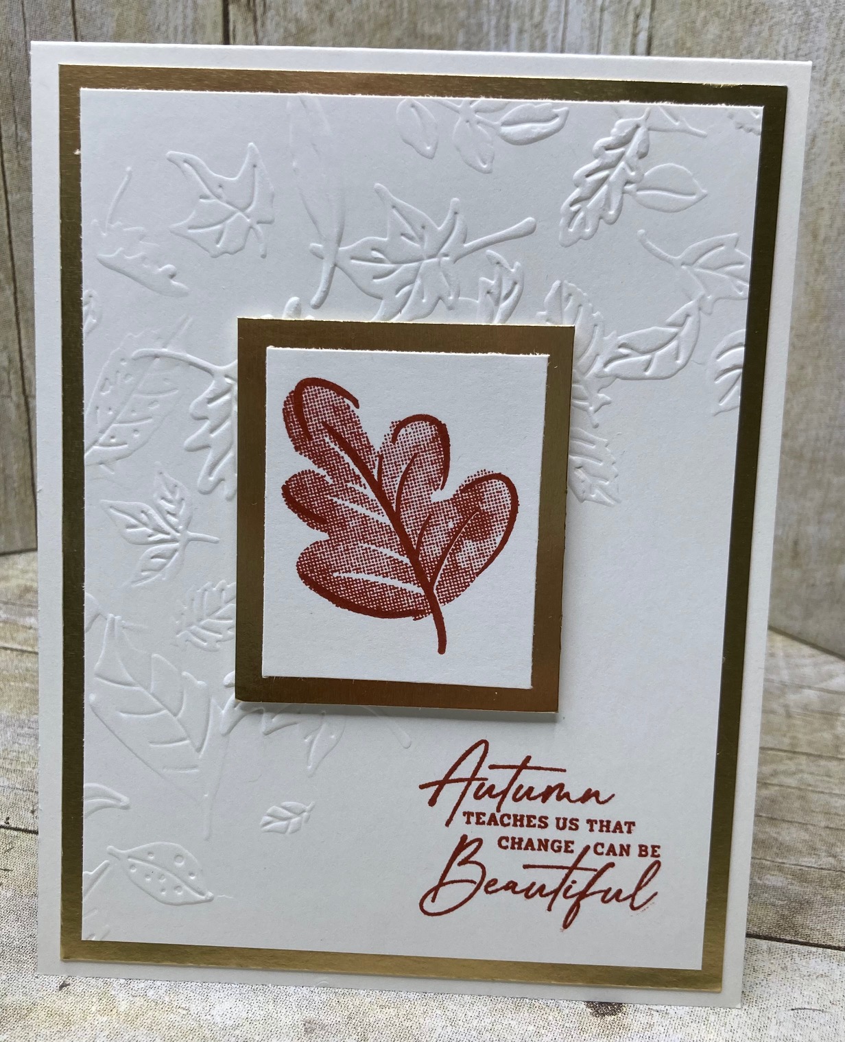 I stamped the greeting (from the Autumn Leaves Stamp Set) before embossing the card, that way I was able to position the card so it didn’t get embossed. Everything else was attached with Multipurpose Liquid Adhesive except the centre panel which is popped up on Stampin Dimensionals.