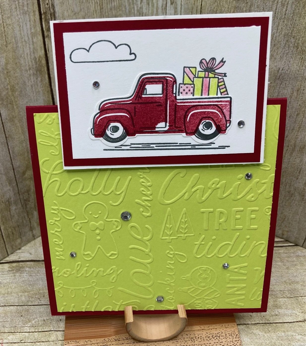 The stamp set is Truckin’ Along with the coordinating Truckin’ Along Builder Punch. I used my Watercolour Pencils for the gifts and a Basic Rhinestone Jewel for the centre of the bow!