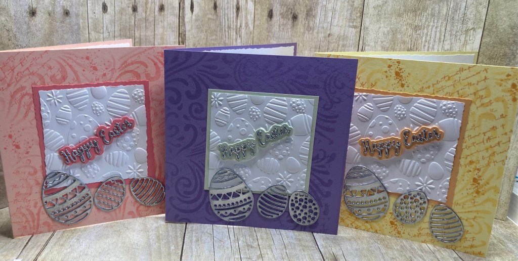 Here we are in Easter week……….. already!!! The trees are starting to show their leaves here in the East Midlands of the UK, spring is definitely in the air! I decided to make a square card ~ cannot remember the last time I made one of this size and shape. I enjoyed making it so much I ended up making 7 in all, different bright, springtime colors and with a double heat embossing technique to make my embellishments really pop!