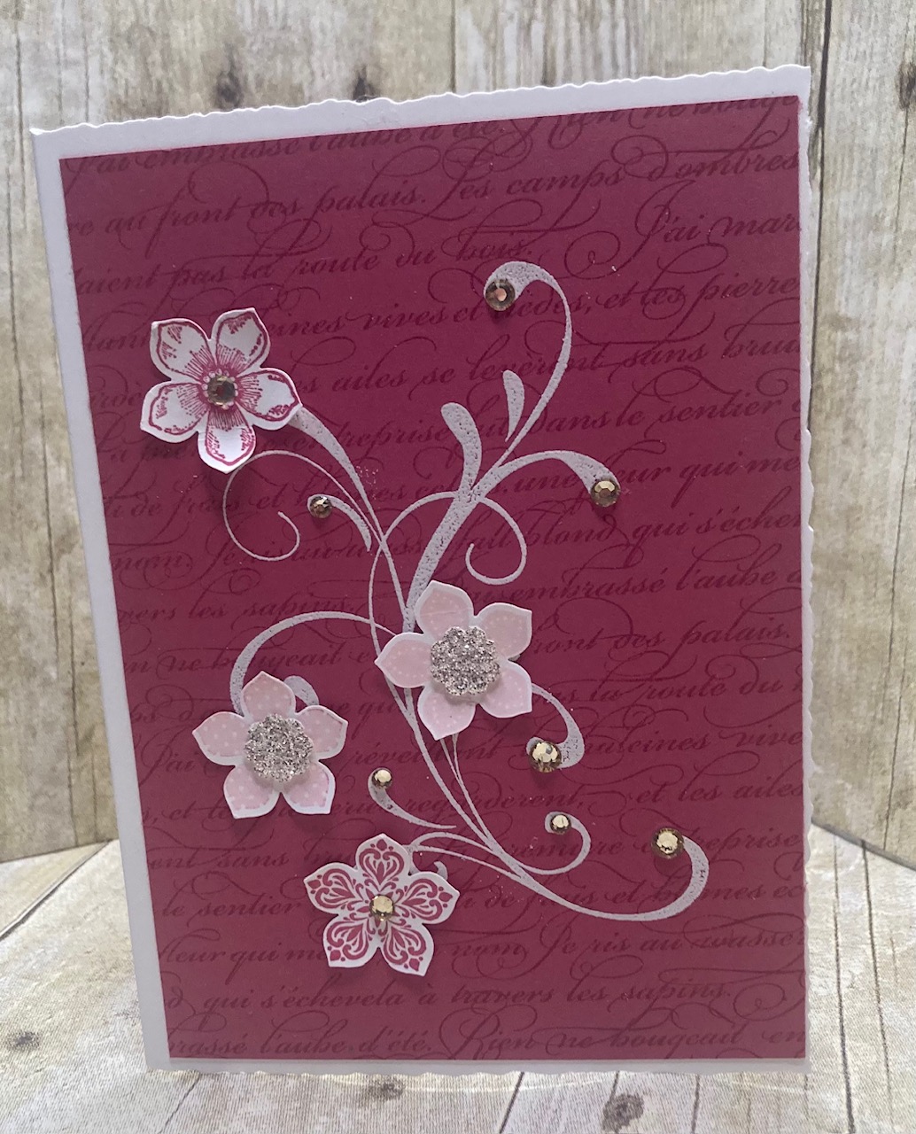 I cannot begin to tell you how old the stamp sets used in this card are, probably over 10 years!! I found a small packet of pieces in my ‘odds n ends’ box that was clearly supposed to be a card but I never got around to finishing it. I decided to put together with a plain white card base and some rhinestones and I really love it. Don’t forget to look around for those little things you may have squirreled away – you just might find a treasure too! 🙂