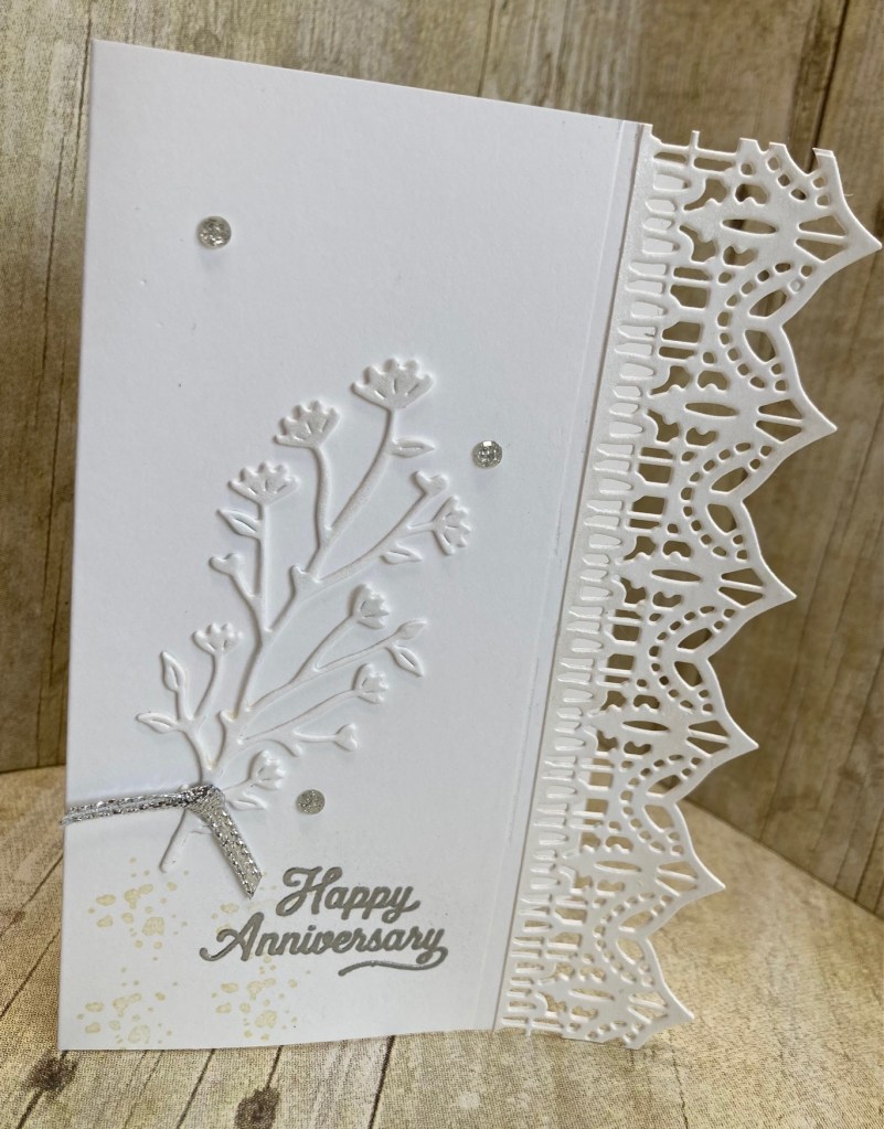Although the picture does not do it justice, the lacy piece on the side as well as the leafy stem have been painted with a pearlized ink and the greeting is silver embossed. I will be sharing this easy technique in a video in the near future 🙂