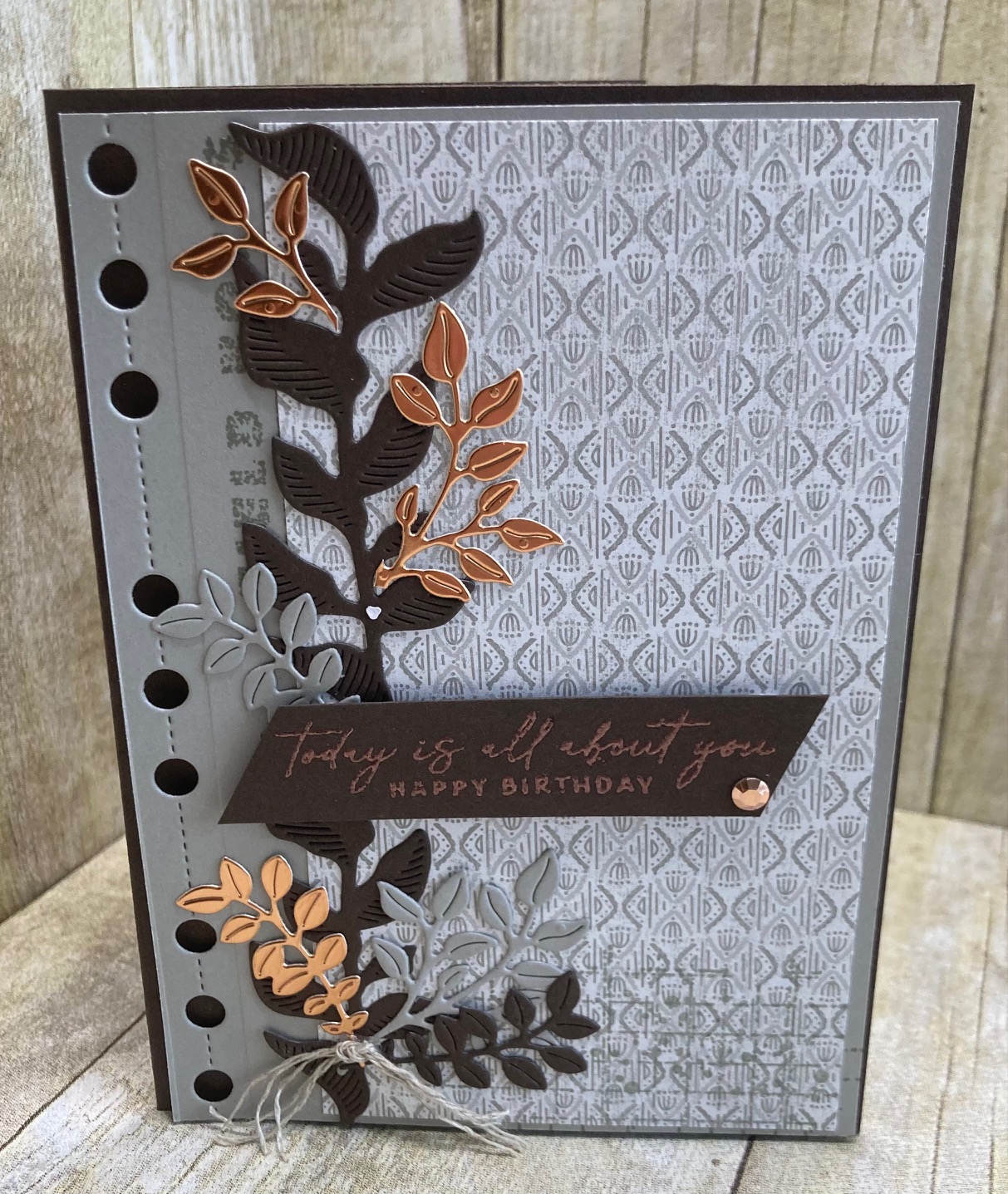 The problem with masculine cards is I find them difficult to make! With this card I pulled out some masculine colours, some leaf dies and a bit of copper heat embossing. I am quite delighted with the result!!