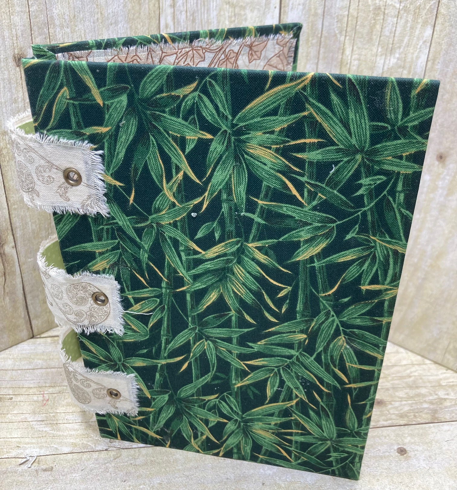 It has taken me months to get to this stage……….. to summon up the courage to make the cover for my green foliage themed junk journal. It is an unusual cover to go with the unusual signature (pages) I created. I have used fabric as I think it will be more robust than paper