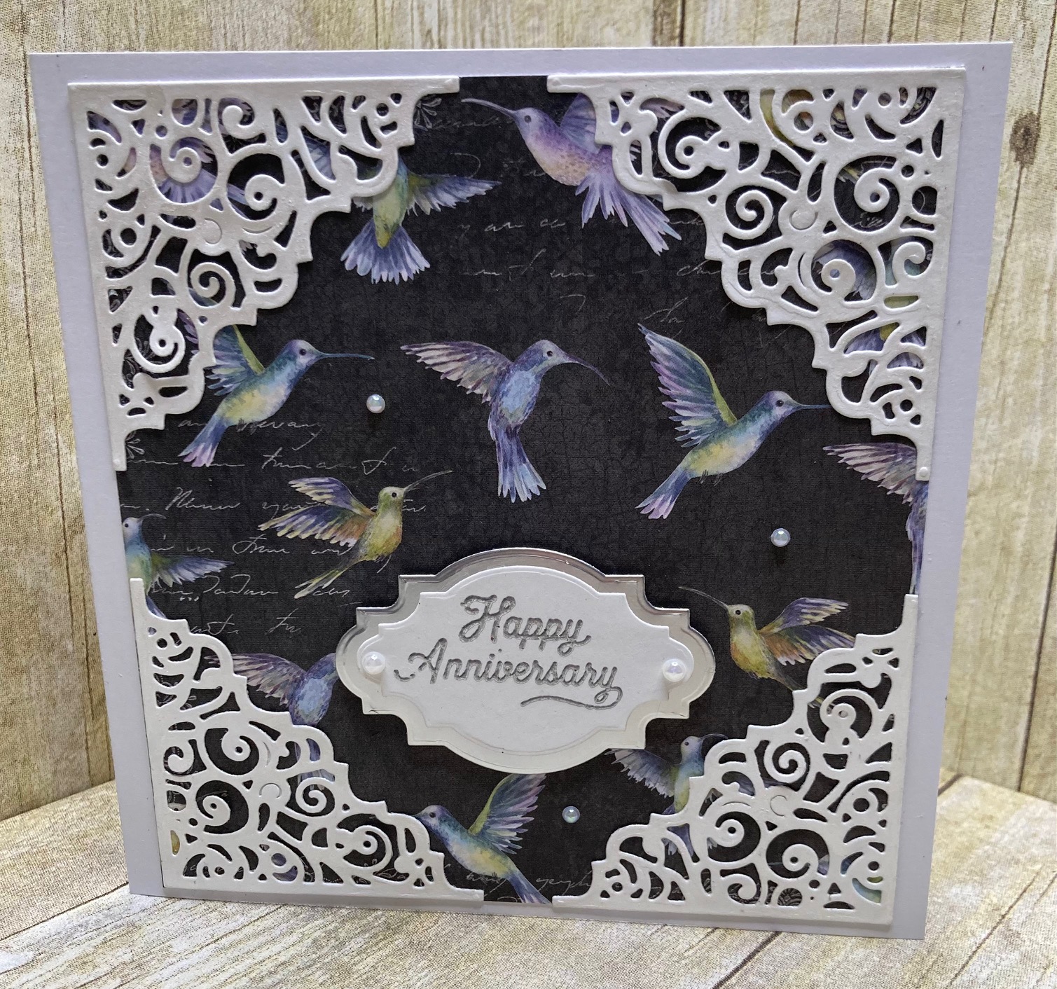 Continuing with my quest to try out new ideas and products todays square card uses humming bird themed decorative paper for its focal point and then some pretty die cuts to bring some extra elegance.