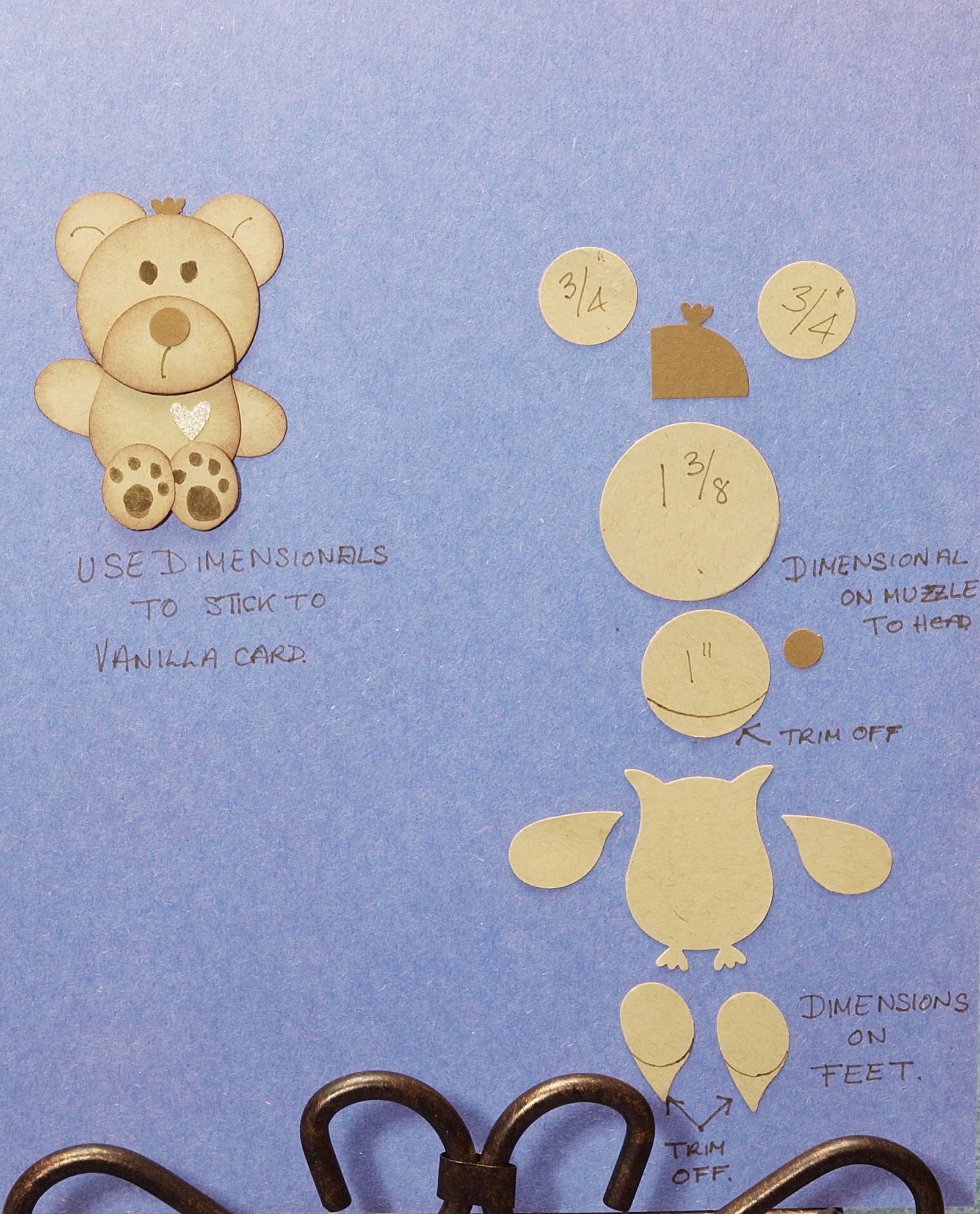 All the pieces are cut from Crumb Cake and were sponged in ‘Soft Suede’ ink. The nose and tuft were cut from Soft Suede card stock. I used the Chocolate Chip stampin marker to put on his features and cute little toes.